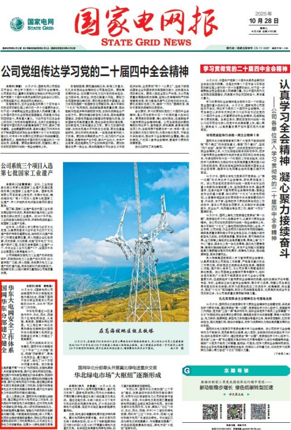 10月28日,《国家电网报》发表《国网华东分部建立健全华东大电网安全工作体系》新闻稿,现全文转载如下。